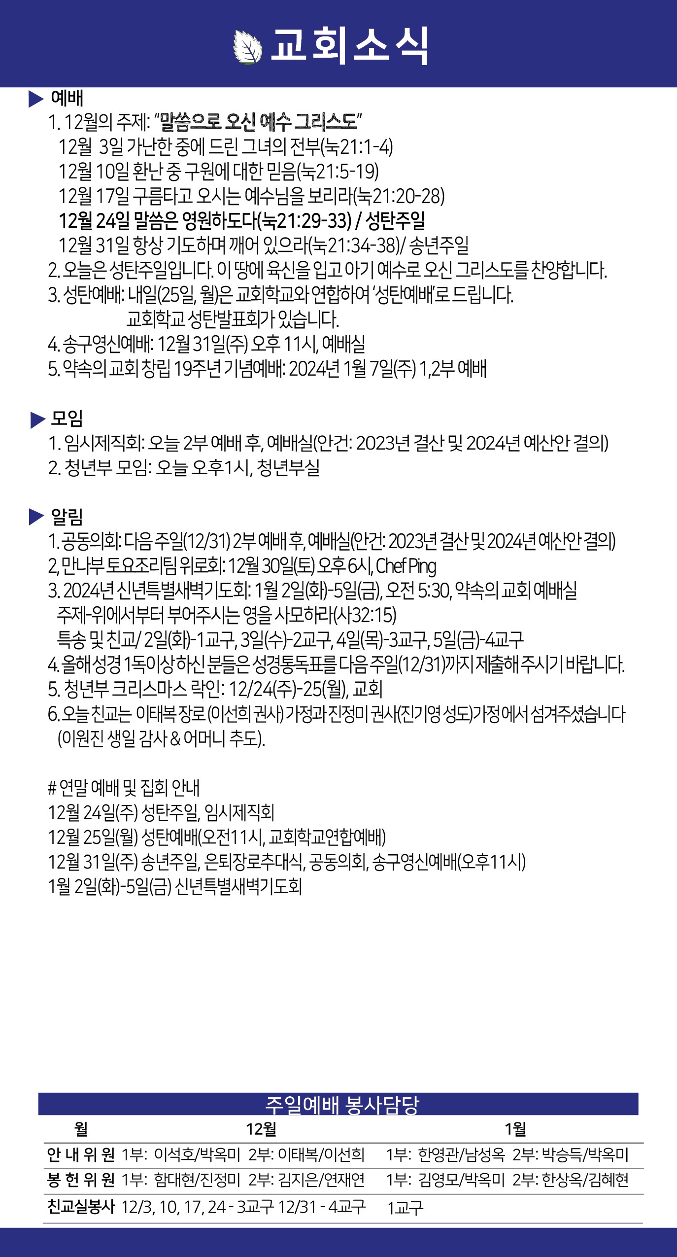 2023년 12월 31일 약속의 교회 주보