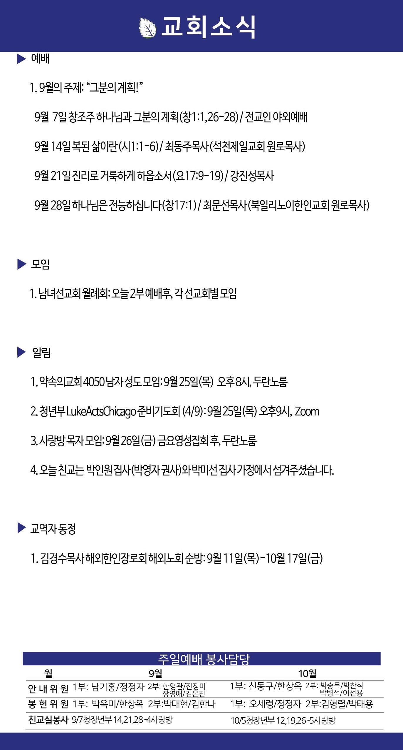 2025년 9월 7일 약속의교회 주보