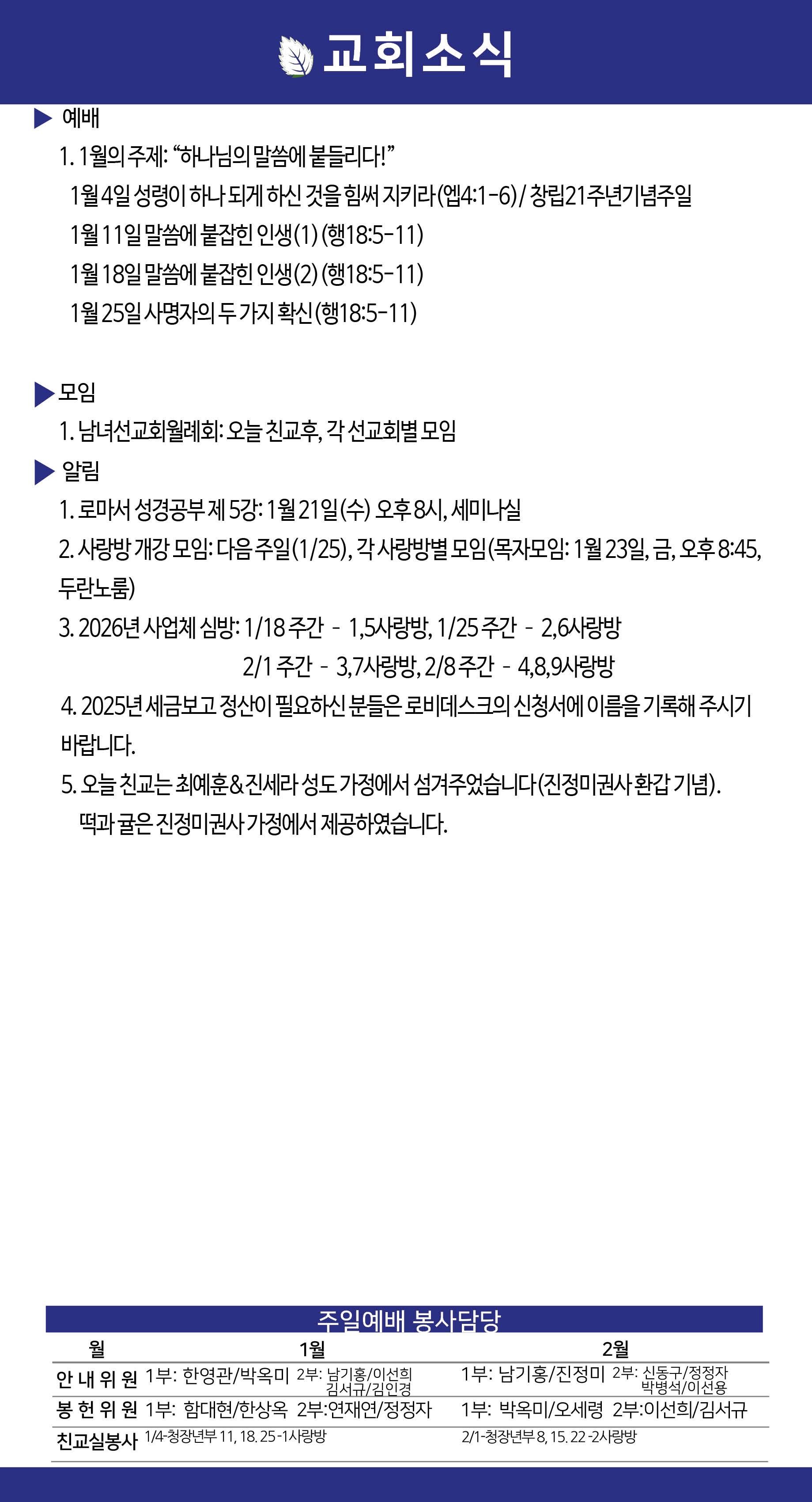 2026년 1월 25일 약속의교회 주보