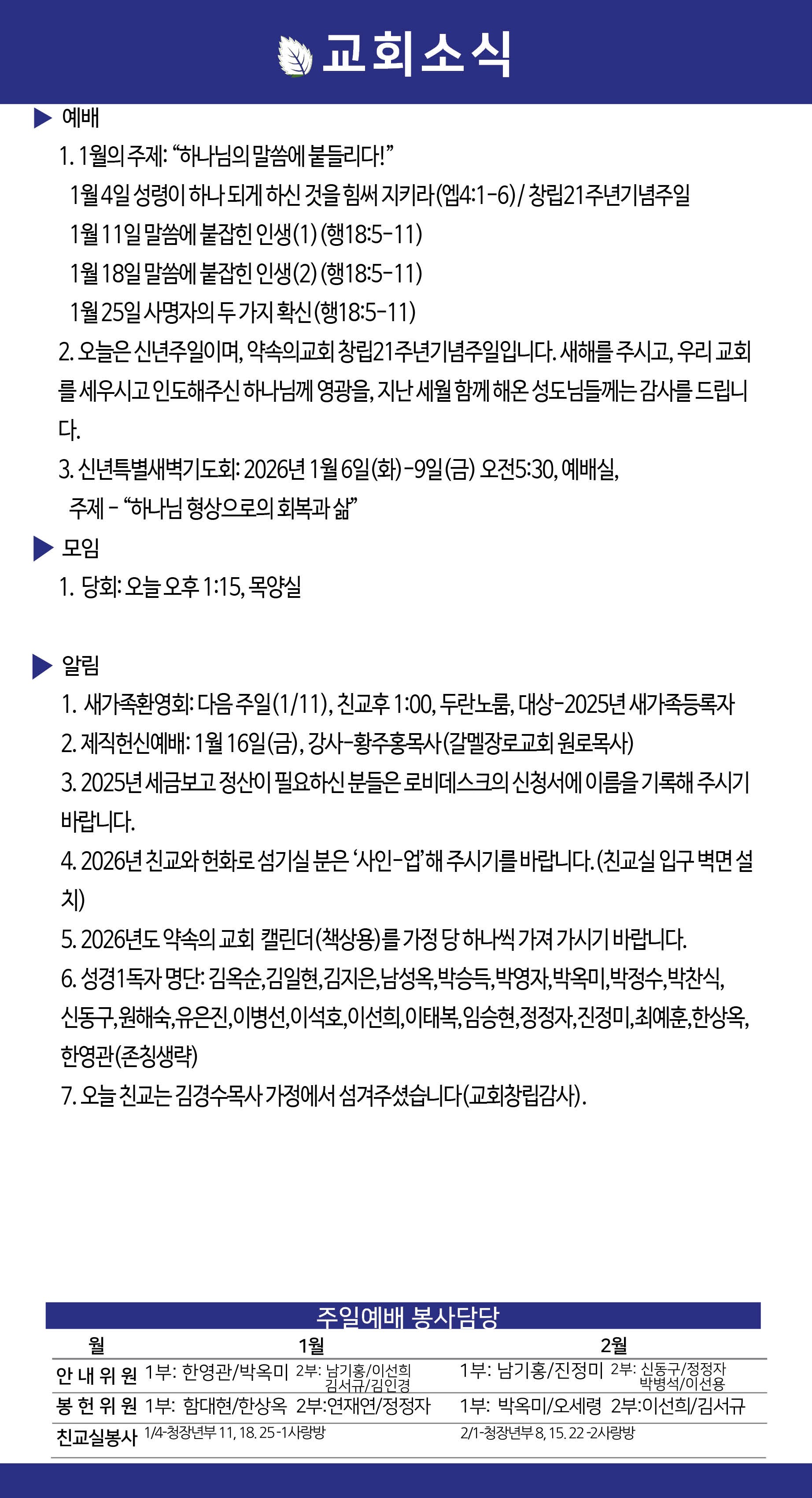 2026년 1월 25일 약속의교회 주보
