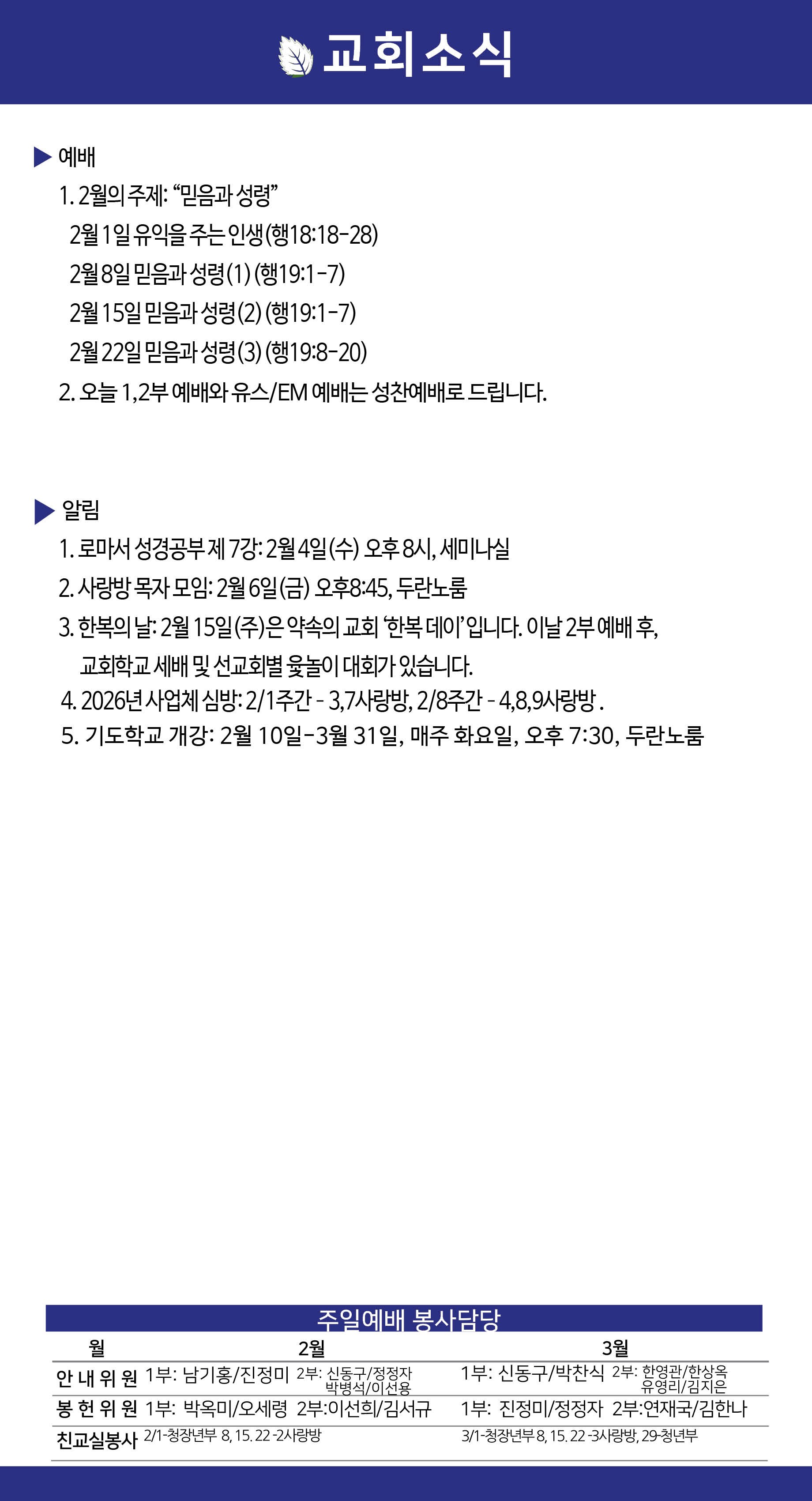 2026년 2월 1일 약속의교회 주보
