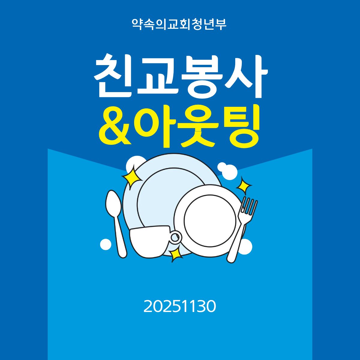 ✔ 교회봉사: 청년부는 일년에 4-5번 주일 식사와 장애인과 함께하는 말알체육대회와 교회대청소를 섬기며 봉사를 실천합니다.